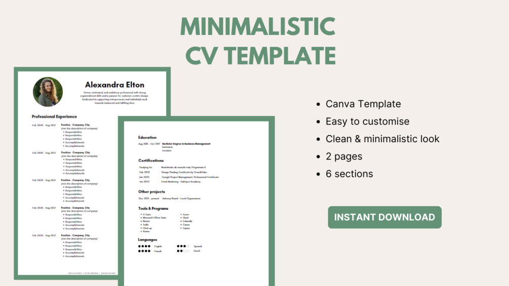 You will receive a PDF with a link to the Canva template - then you can easily customise the CV template and make it your own!